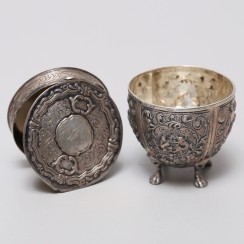 С гравировкой. ========================== Silver pill box (trinket box), decorated with floral ornaments.