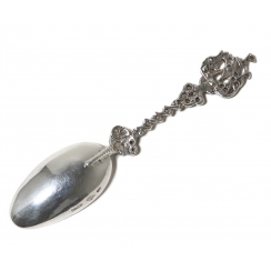 Серебряная сервировочная ложка с парусником на ручке.