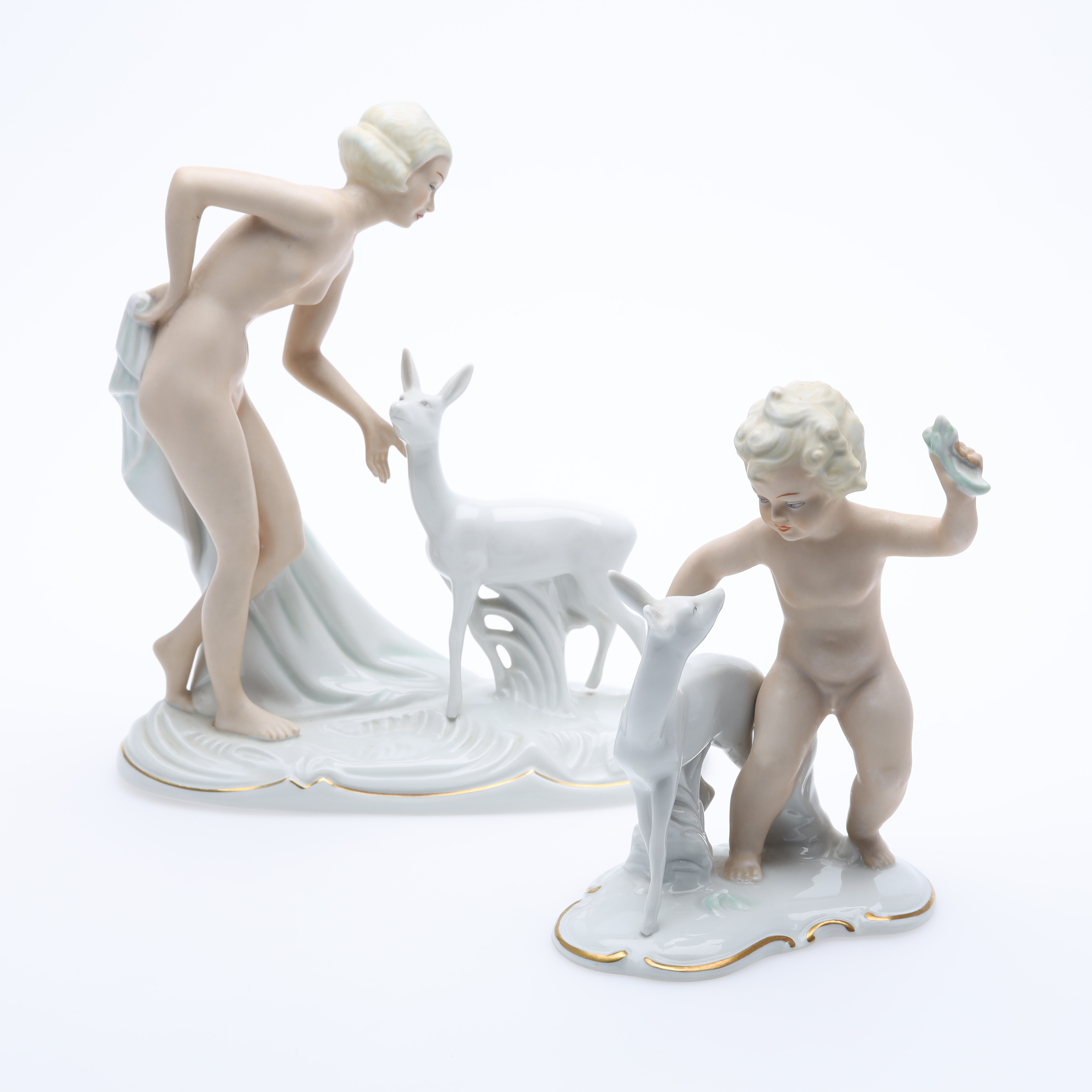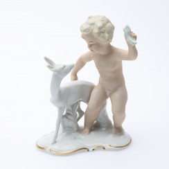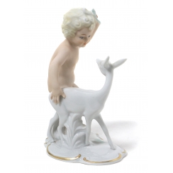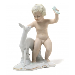 Такая же фигура выпускалась фабрикой Wallendorf с номером модели 1347. ======================================= Porcelain figurine "Nude boy (putti) with roe deer". Hand-painted.