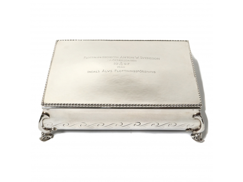 С гравировкой "Начальник сплава древесины Антон В. Свенссон. К 50-летию (1927). От Ассоциации сплава реки Индальсэльвен" ==================================== Silver box (casket) with wooden trim.