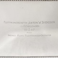 There is engraving "Flottningschefen Anton W. Svensson – 50-årsdagen 1927 från Indals älvs flottningsförening".