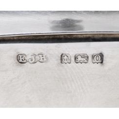 Высота по хватку на крышке: 5,5 см, размеры верха чаши: 7 х 5 см. Вес без стеклянной вставки: 53 грамма серебра 925 пробы.