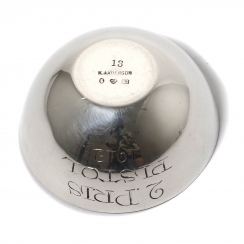 Высота: 2,5 см, диаметр верха: 5,4 см. Вес: 22 грамма серебра 830 пробы.