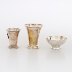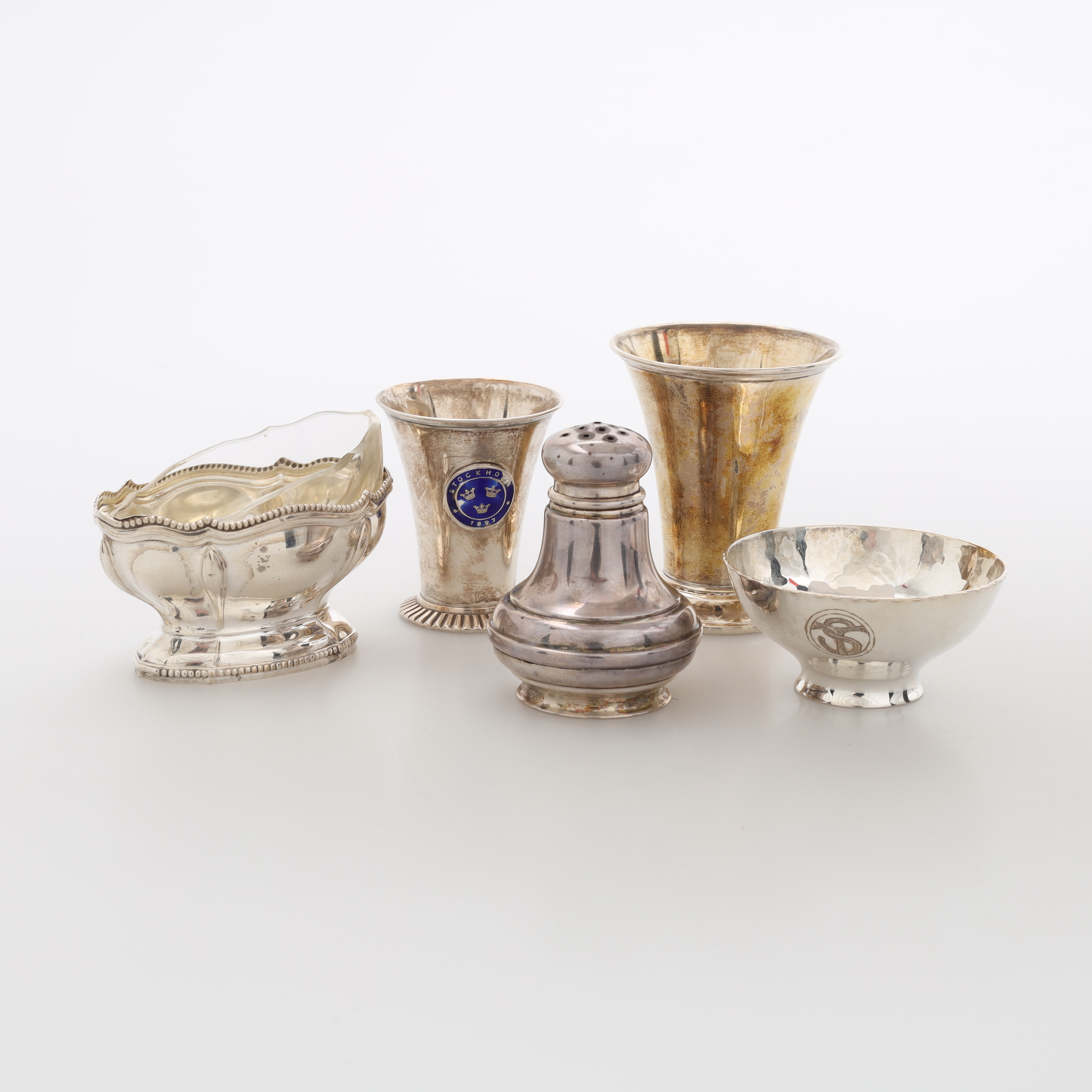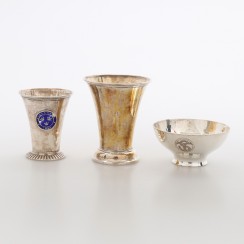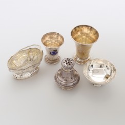 Информация о лоте 366220 - Стопка в виде кубка, 23 гр, 830 пр, высота 6,5 см, диаметр верха 5 см 256613 - Стопка в виде кубка с эмалевым гербом, 15 гр, 830 пр, высота 5 см, диаметр верха 4 см 355512 - Солонка (ковка), 37 гр, 830 пр, высота 2,8 см, диаметр верха 5,8 см 377663 - Серебряная солонка со стеклянной вставкой, вес без стекла 19 гр, высота 4 см, размеры верха 7 х 4 см 222873 - Солонка, 16 гр, 830 пр, высота 5,8 см, диаметр верха емкости 1,7 см |