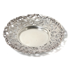 Высота: 1,3 см, диаметр верха: 10,3 см. Вес: 50 граммов серебра 830 пробы. ========================= Silver open-work bowl, decorated with plant ornaments.