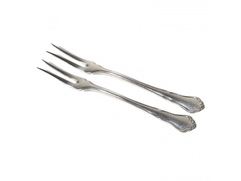Серебряные сервировочные вилки, 2 шт. Дизайн "Рита" (Rita). Ввезены в Швецию, г. Хельсингборг, 1938 год, импортер Hoff Carl (годы работы: 1913-1941). Государственное пробирное клеймо Швеции для ввезенных серебряных изделий. Длина: 12,7 см. Общий вес: 32 грамма серебра 830 пробы. =============================== Silver serving forks, 2 pcs. Pattern "Rita".