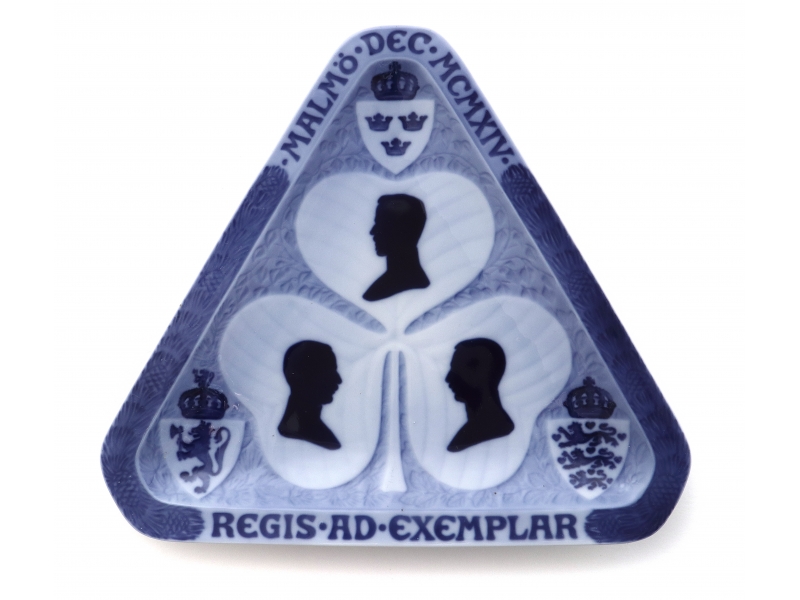 Памятное фарфоровое блюдо с силуэтами королей Дании, Норвегии и Швеции и гербами Стран. Выпущено по случаю встречи трех скандинавских королей в г. Мальмё (Швеция), в 1914 году. Ручная подглазурная роспись.