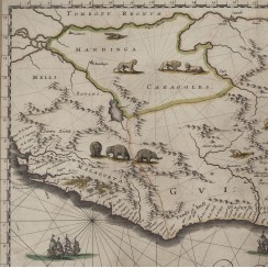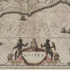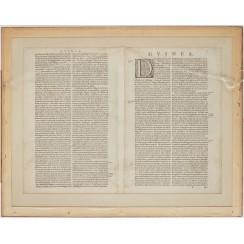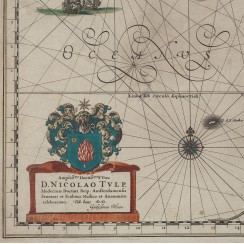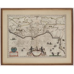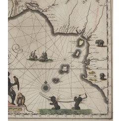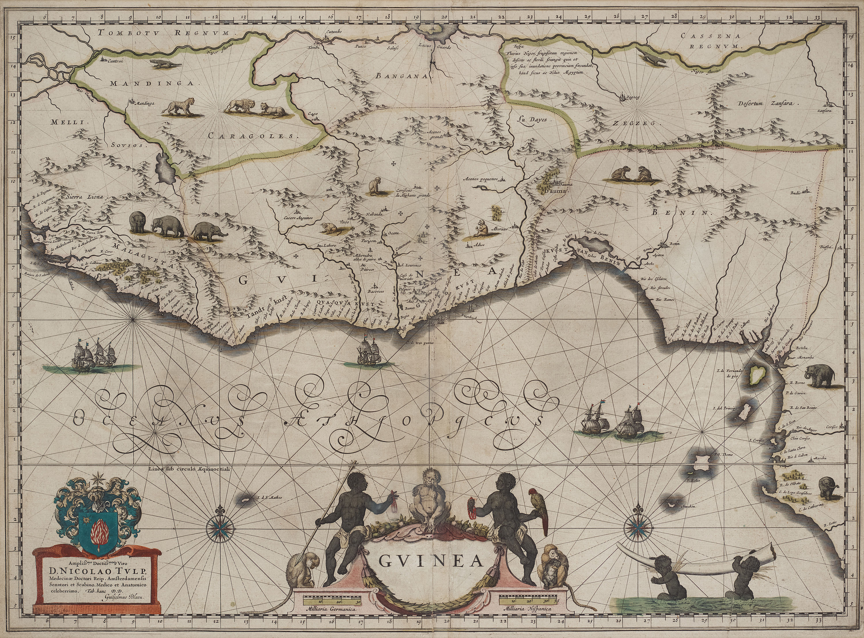 Часть карты Гвинеи из 12-томного "Большого атласа...", впервые изданного в г. Амстердаме в 1667 году известным голландским картографом Яном Виллемом Блау (1571- 1638), который впоследствии был признан шедевром голландского картографического искусства XVII века. Карта посвящена "выдающемуся и ученому мужу" Николасу Тульпу (1593-1674), голландскому врачу и анатому, члену правительства Амстердама (в левом нижнем углу герб с посвящением). Размеры листа 54,5 х 45 см; размеры изображения 52,3 х 38,2 см.