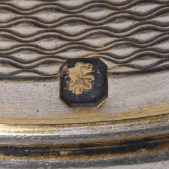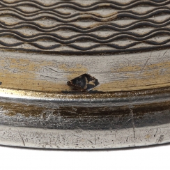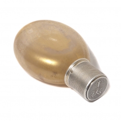 Фляжка, стекло, серебро 950 пробы. Стекло декорировано позолоченным покрытием, имитирующим кракелюр.