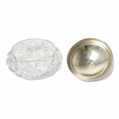 Максимальная высота: 11,5 см, высота по край: 7 см, диаметр верха: 12,3 см. Вес крышки: 109 граммов серебра 826 пробы. ========================== Crystal sugar bowl with a silver lid.