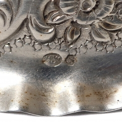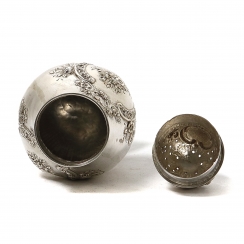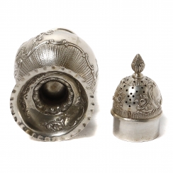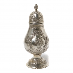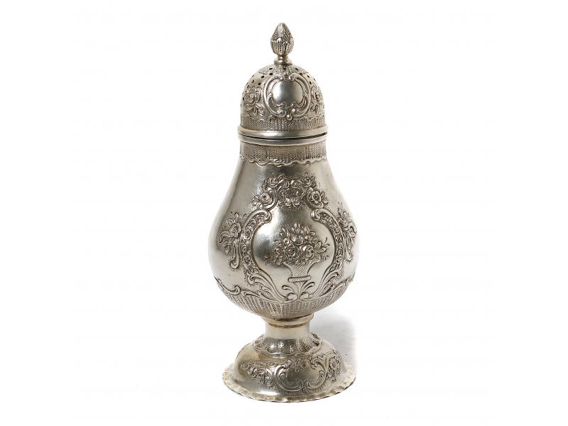 Серебряная ёмкость для сахарной пудры, декорированная цветочным узором.