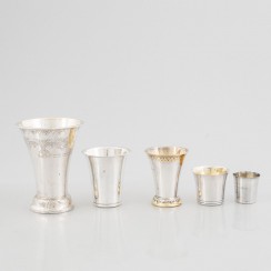 Высота: 9 см, диаметр верха: 7,8 см. Объём: 150 мл. Вес: 63 грамма серебра 830 пробы.