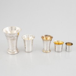 Height: 5.5 cm, diameter the of top: 6.2 cm. Volume: 100 ml. Weight: 39 grams of silver 830 fineness.
