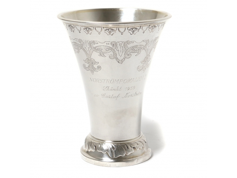 Незначительная вмятинка на ребре основания. С гравировкой "Кубок Норстрема I Lkankt 1959 года, автор Густав Нордстрем". ============================== Silver beaker in the form of a goblet.