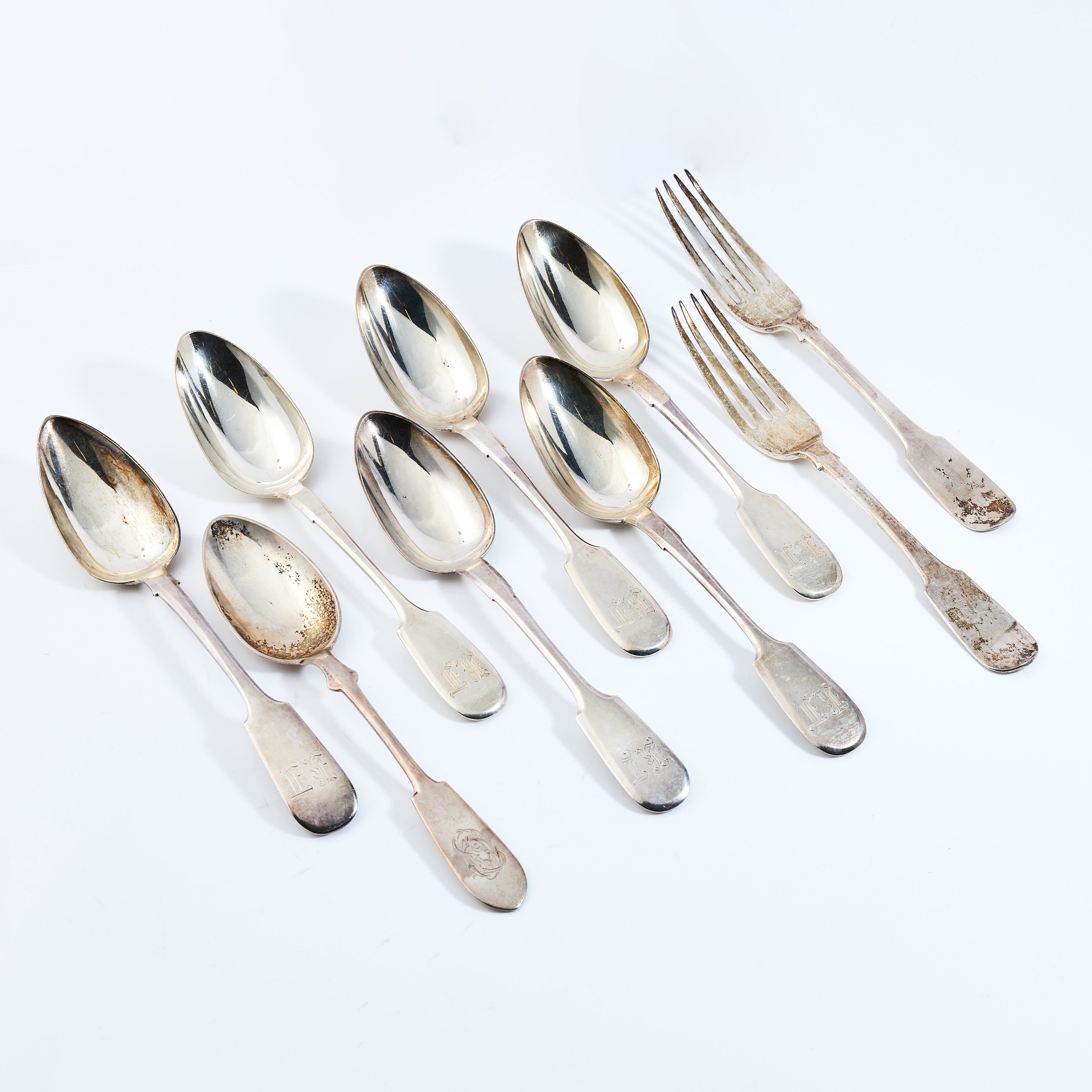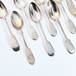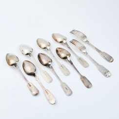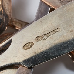 Пробирные российские клейма 19 века: "ЭБ" - инициалы пробирного мастера Эдуарда Федоровича Бранденбурга (годы работы: 1850-1866); цифра "1852" указывает год клеймения; цифра "84" удостоверяет, что изделие выполнено из серебра 84 золотниковой пробы; "два якоря, положенных накрест" - клеймо города Санкт-Петербурга. ============================= Silver dinner forks, 2 pcs.