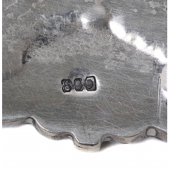 Высота: 5 см, диаметр: 29,5 см. Вес: 467 граммов серебра 800 пробы. ======================== Sterling silver bowl (dish) on legs.