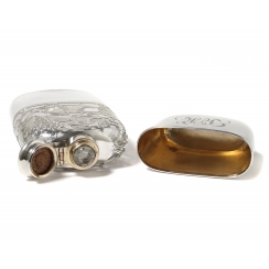 Размеры: 16 х 9,2 х 4 см. Объем фляжки: 200 мл, стакана: 130 мл. Серебро 925 пробы.
