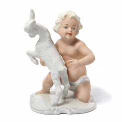 Фарфоровая фигура (статуэтка) "Обнаженный мальчик (путти) с козленком". Ручная роспись.