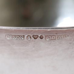 Height: 4 cm, diameter of the top 6.5 cm. Volume: 40 ml. Weight: 32 grams of silver 830 fineness.
