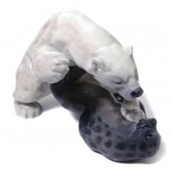 Фигуру продолжали производить также после объединения фабрик Royal Copenhagen и Bing & Grondahl (1985-1989) под брендом Royal Copenhagen, с новым номером модели: 086. =============================== Porcelain figurine "Polar white bear & seal". Hand-painted underglaze.