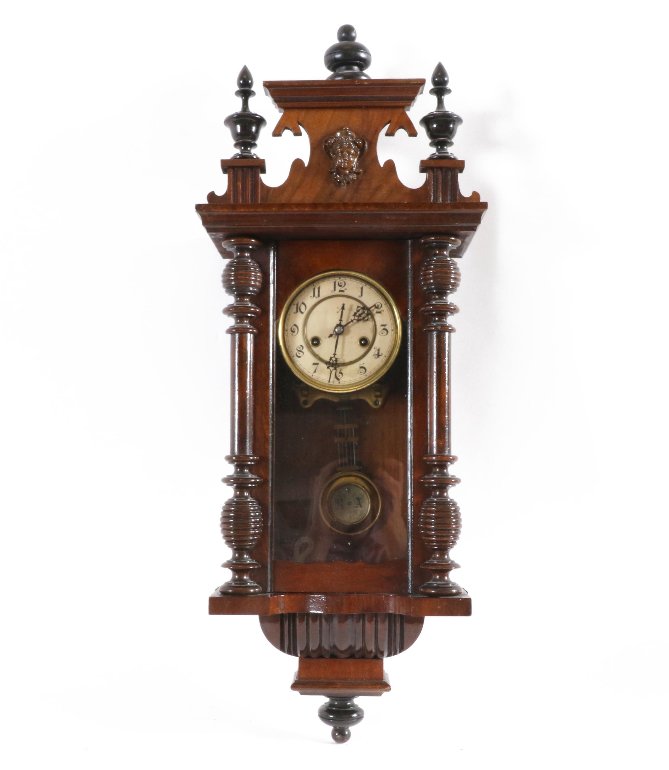 Настенные часы в деревянном корпусе, модерн. Максимальная длина 87 см, ширина 33,2, диаметр циферблата 13 см. Маятник и ключ в комплекте. На лако-красочном покрытии корпуса несколь мелких сколов, потертости. Утрачены два декоративных элемента на нижней панели.