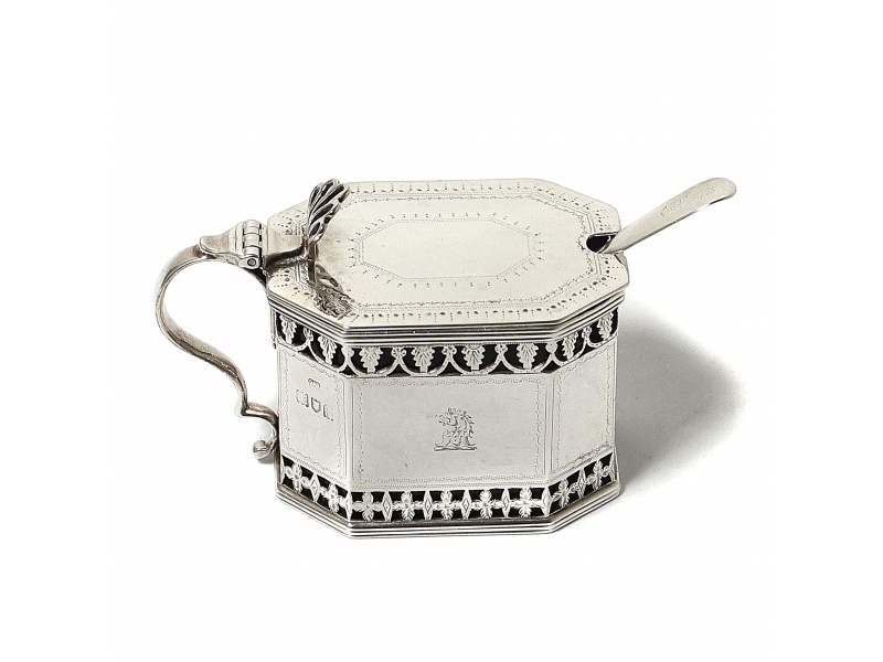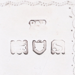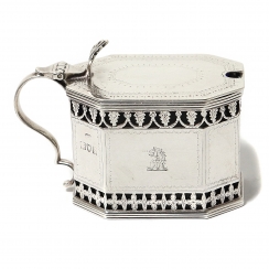 Горчичница произведена в Англии, г. Лондон, 1913 год, мастерская D & J Wellby Ltd (зарегистрирована в 1910 году). Высота по верх крышки: 5,5 см, основание: 7,5 х 5,5 см. Вес без стекла: 150 граммов.
