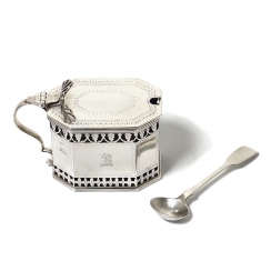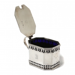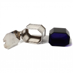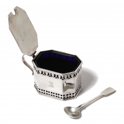 Серебряная горчичница с кобальтовой вставкой и ложкой.