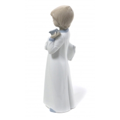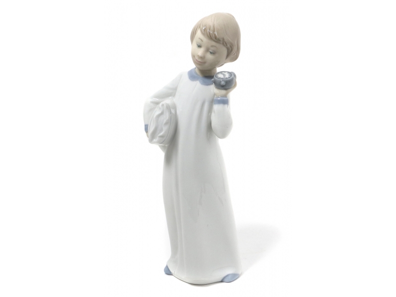 Фарфоровая фигура (статуэтка) "Мальчик с будильником и подушкой". Ручная подглазурная роспись.