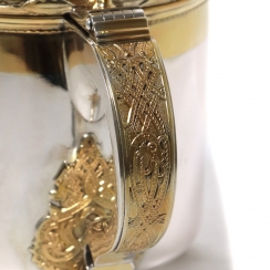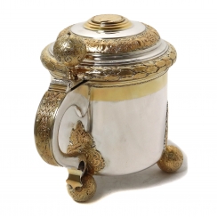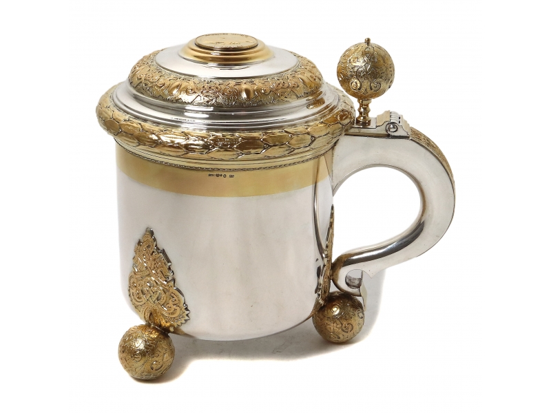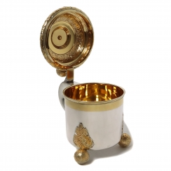 Серебряная кружка с откидной крышкой на ножках-шарах. Позолота. На крышке медальон с профилем короля Швеции Густава V (годы правления: 1907 - 1950) с надписью по кругу" Gustaf V Sveriges Konung".