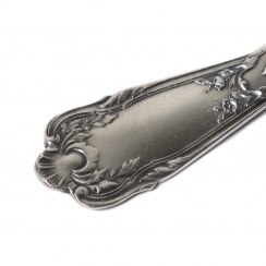 Общий вес цельно серебряных приборов: 104 граммаов серебра 84 золотниковой пробы ( = 875 метрической пробе). Общий вес ножа с серебряной ручкой и стальным лезвием: 60 граммов.