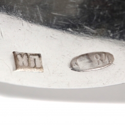 Трехзначное пробирное российско-советское клеймо в овале 1908-1926 гг. - "женская голова в кокошнике, обращенная вправо" с литерой "Δ" (дельта) и цифрой "84", где: "женская голова в кокошнике, обращенная вправо" - знак удостоверения; "Δ" (дельта) - шифр Московского пробирного управления; цифра "84" удостоверяет, что изделие выполнено из серебра 84 золотниковой пробы.