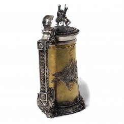 Высота по хватку на крышке: 24,5 см, диаметр основания: 13,7 см, диаметр верха: 8,5 см. Объём: 800 мл. Вес: 1364 грамма, серебро 925 пробы. =============================== Silver mug (tankard) with a lid, decorated with scenes from the Patriotic War of 1812, "The Battle of Borodino".