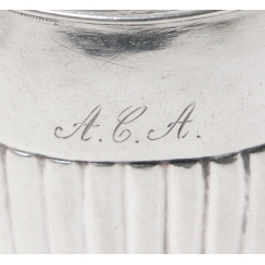 Высота: 3,7 см, диаметр верха: 6,5 см. Объем: 45 мл. Вес: 33 грамма серебра 830 пробы.