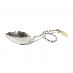Серебряная сервировочная ложка с винтовой ручкой и подвеской в виде листочка.