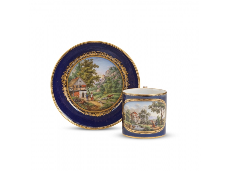 Высота чашки по край 6,5 см, диаметр 6,5 смДиаметр блюдца 13,2 см, высота 3 смМестами утрачена позолота на верхнем ободке кружки