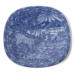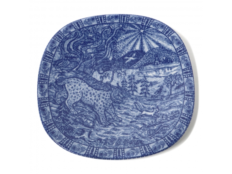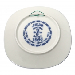 Коллекционная фарфоровая тарелка 1984 года из серии "Рождество" с мотивом из знаменитой книги Сельмы Лагерлёф «Чудесное путешествие Нильса Хольгерссона с дикими гусями по Швеции». На тарелке 1984 года изображён сюжет, посвящённый провинции Медельпад: на переднем плане запечатлена рысь (символ региона), а над зимним лесом виден Нильс на гусе, летящий в лучах Вифлеемской звезды.