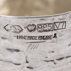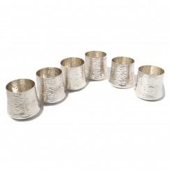 Высота: 7,5 см, диаметр верха: 6,5 см. Объём: 250 мл. Общий вес: 1156 граммов серебра 925 пробы. ============================ Silver beakers, 6 pcs. Forging. Designed by Tapio Wirkkala. Handmade (haands medet).