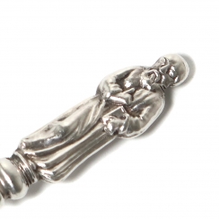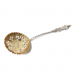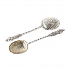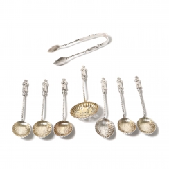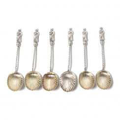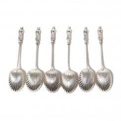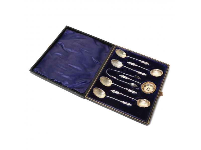 Набор из шести серебряных кофейных ложек с апостолами, ситечка и щипцов для сахара. В оригинальной коробке.