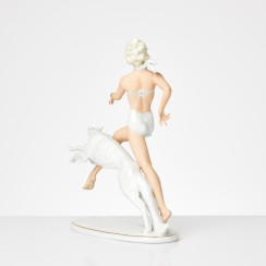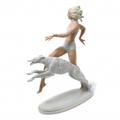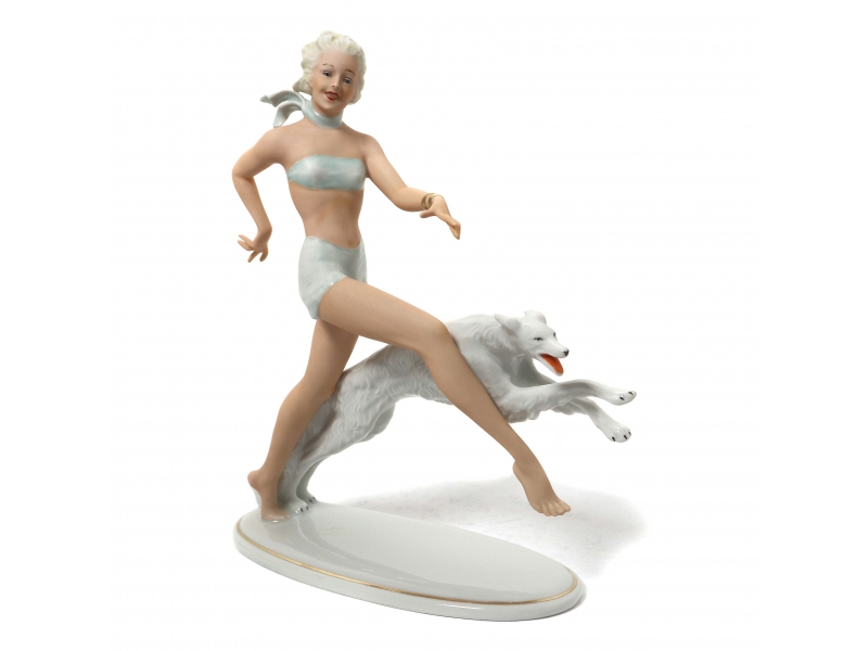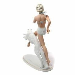 Фарфоровая фигура (статуэтка) "Девушка, бегущая с собакой". Ручная роспись.