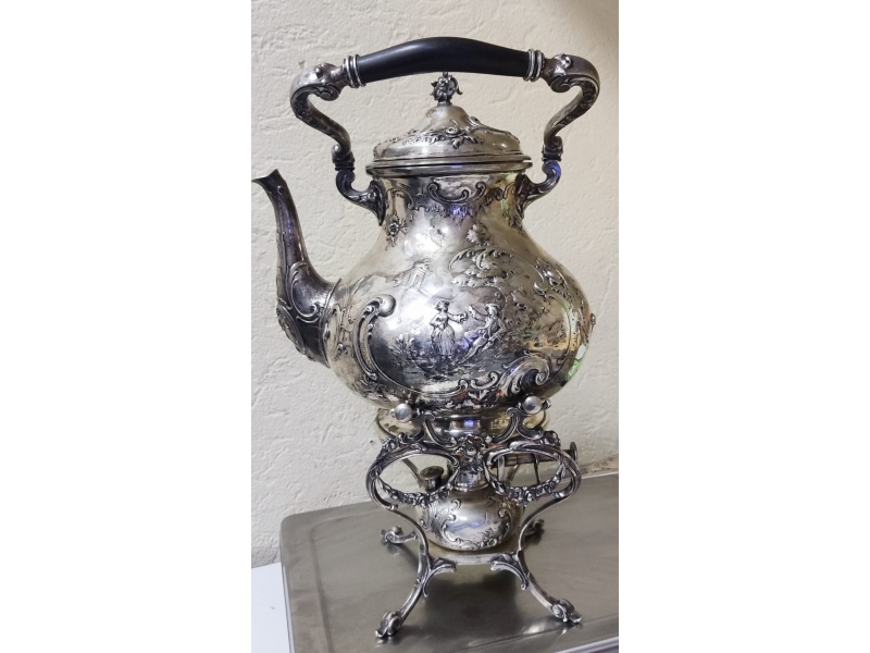 Бульотка (чайник на подставке с горелкой), Гермния, 2153 гр, 800 пр Максимальная высота в сборе (по верх поднятой ручки) 43,5 см Высота чайникапо хватку на крышке 24,5 см, диаметр основания чайника 12,8 см, диаметр верха чайника 11,5 см Размры подставки: максимальная длина 17 см, ширина 13,8 см, высота 16 см