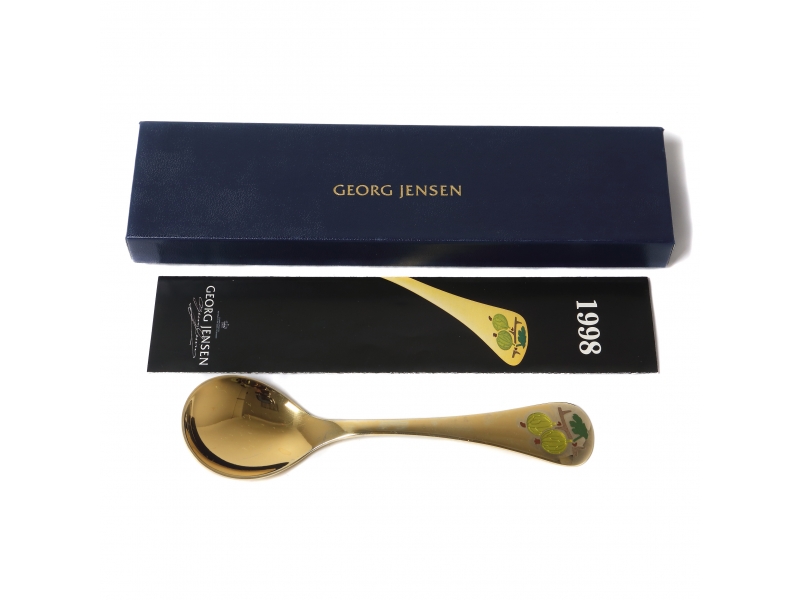 Georg Jensen, Дания: Коллекционная годовая десертная ложка "Крыжовник" 1998 года. Серебро, позолота, эмаль. В оригинальной коробке.