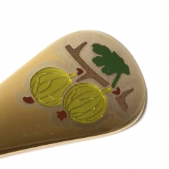 "Georg Jensen" - один из старейших дизайнерских домов Скандинавии, основанный в 1904 году выдающимся ювелиром Georg Jensen (годы жизни: 1866-1935). С приходом в компанию талантливейших дизайнеров Rigmor Andersen и Annelise Bjørner была разработана годовая серия наборов для десерта. Основным мотивом этой серии стала скромная, но трогательная своей изящной простотой сельская природа Дании. Десертные приборы серии "Растения сельской местности Дании" выпускались с 1971 по 2003 год. ========================================= Georg Jensen: The Danish сollection annual dessert spoon "Gooseberry", 1998. Silver, gilding, enamel. In the original box.
