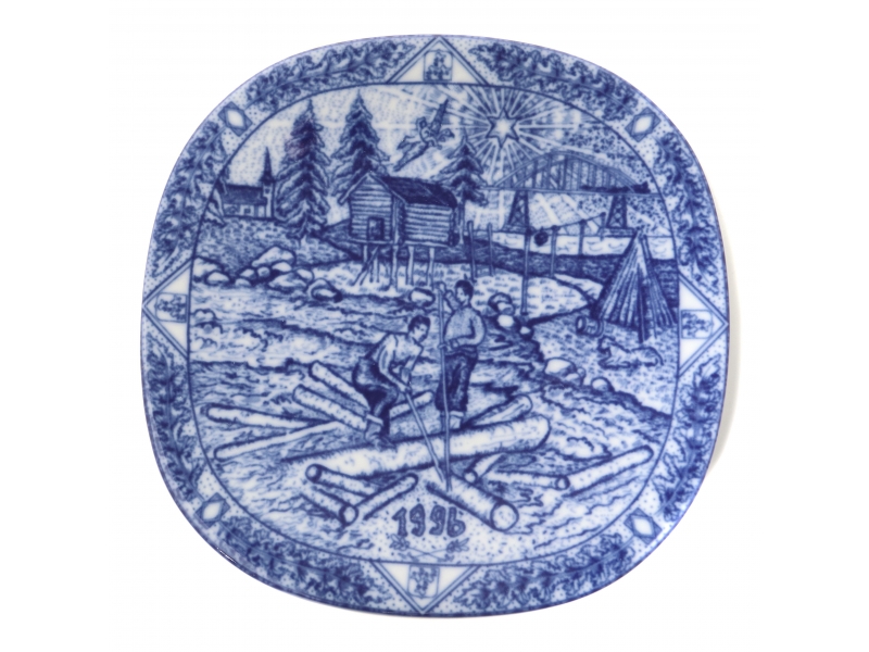 Коллекционная фарфоровая тарелка 1996 года из серии "Рождество" с мотивом из знаменитой книги Сельмы Лагерлёф «Чудесное путешествие Нильса Хольгерссона с дикими гусями по Швеции». На тарелке 1996 года изображена сцена сплава леса по реке (традиционный шведский промысел).
