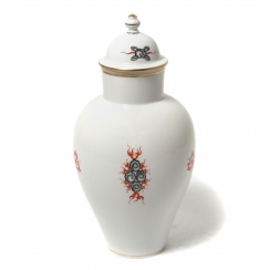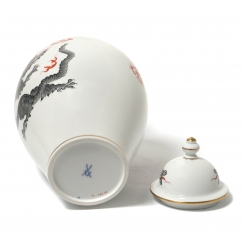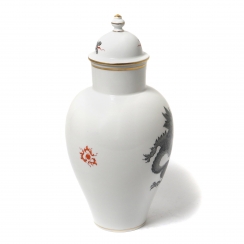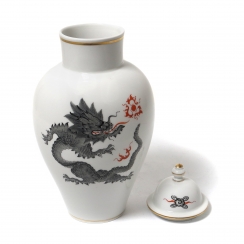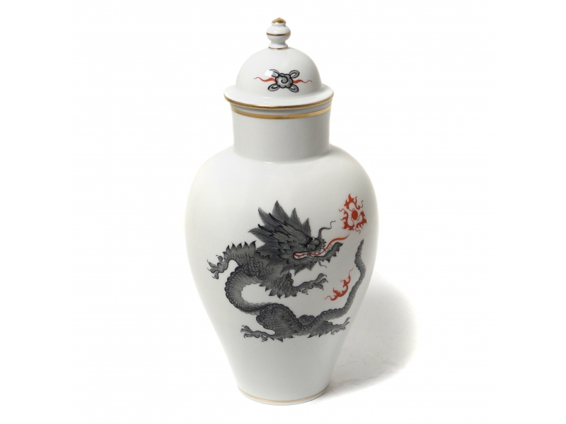 Фарфоровая ваза с крышкой, декорирована рисунком серого дракона, извергающего красно-оранжевое пламя. Дизайн "Дракон Минг" (Ming dragon). Ручная роспись.