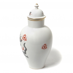 Без сколов, реставраций и повреждений. ========================== Porcelain vase with a lid, decorated with a drawing of a grey dragon spewing red-orange flames. Pattern "Ming dragon". Hand-painted.