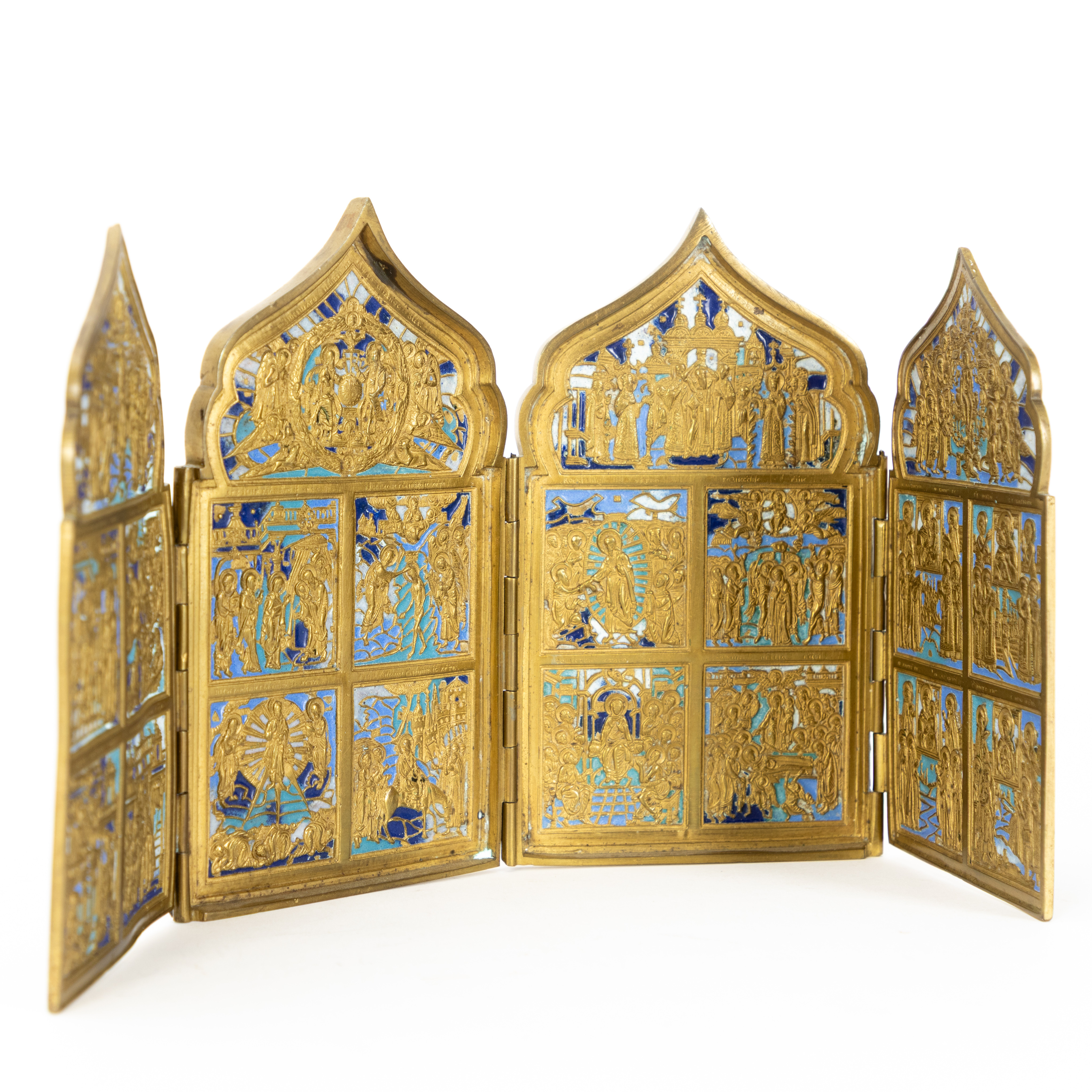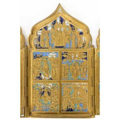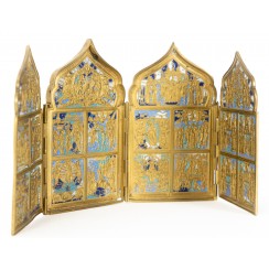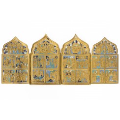 Российская Империя (Россия), 19 век.Размеры сложенного складня: 11 х 18 см.Длина в разложенном виде: 41 см.Несколько сколов на эмали.