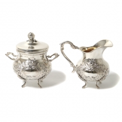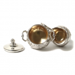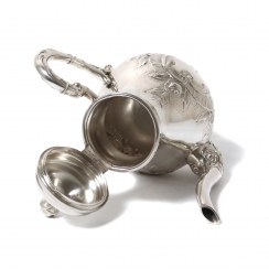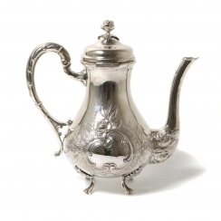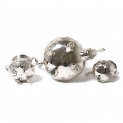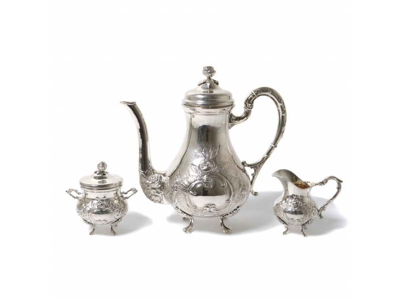 Серебряный кофейный сервиз, 3 предмета, декорирован рельефным узором из роз. Ручная работа.