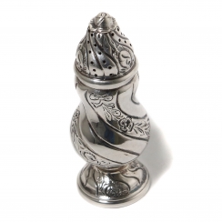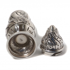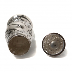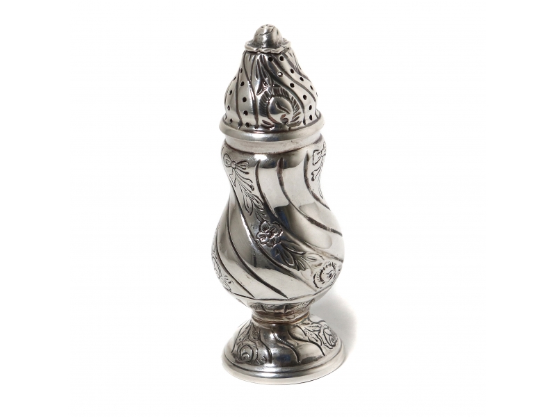 Высота: 10 см, диаметр основания: 3,5 см. Вес: 43 грамма серебра 830 пробы. =============================== Silver salt shaker, rococo, decorated with floral ornaments.