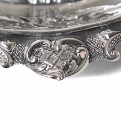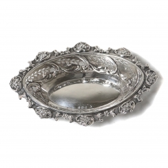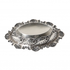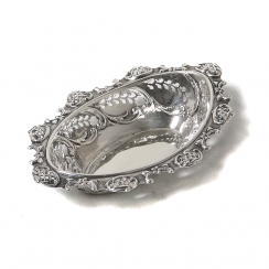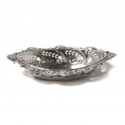 Длина: 13,5 см, ширина: 9 см, высота: 2,8 см. Вес: 35 граммов серебра 925 пробы. ========================= Silver open-work bowl.