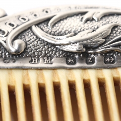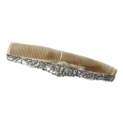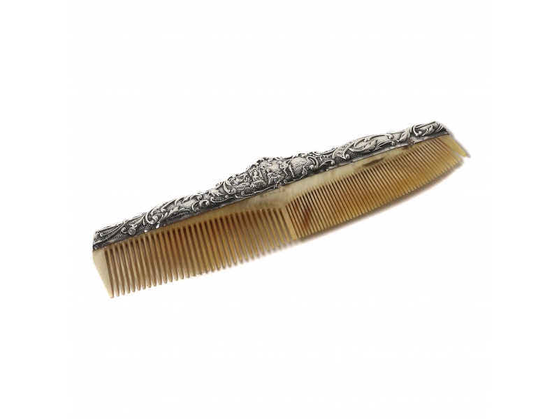 Длина: 19 см, максимальная ширина: 5,2 см. Серебро 925 пробы. ================================== Hair comb in a silver frame, decorated with a relief image of a pastoral scene with people.